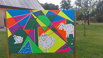 Dieses Tapeart-Bild im Gelände vor Christas Scheune ist fertig gestellt. Es soll Fröhlichkeit vermitteln und Aufmerksamkeit erzeugen. Tapeart ist ein Zweig von Streetart. Für innen oder außen werden verschiedenfarbige Klebebänder in verschiedenen Breiten und zuweilen auch aus verschiedenen Materialien zum Kunstobjekt. Ein Cuttermesser ist dazu noch nötig und ein Filzrakel zum Glätten breiter Bänder. Bei diesem Bild habe ich mich selbst ausprobiert. Ob es Ihnen gefällt oder auch nicht können Sie mir gern schreiben.